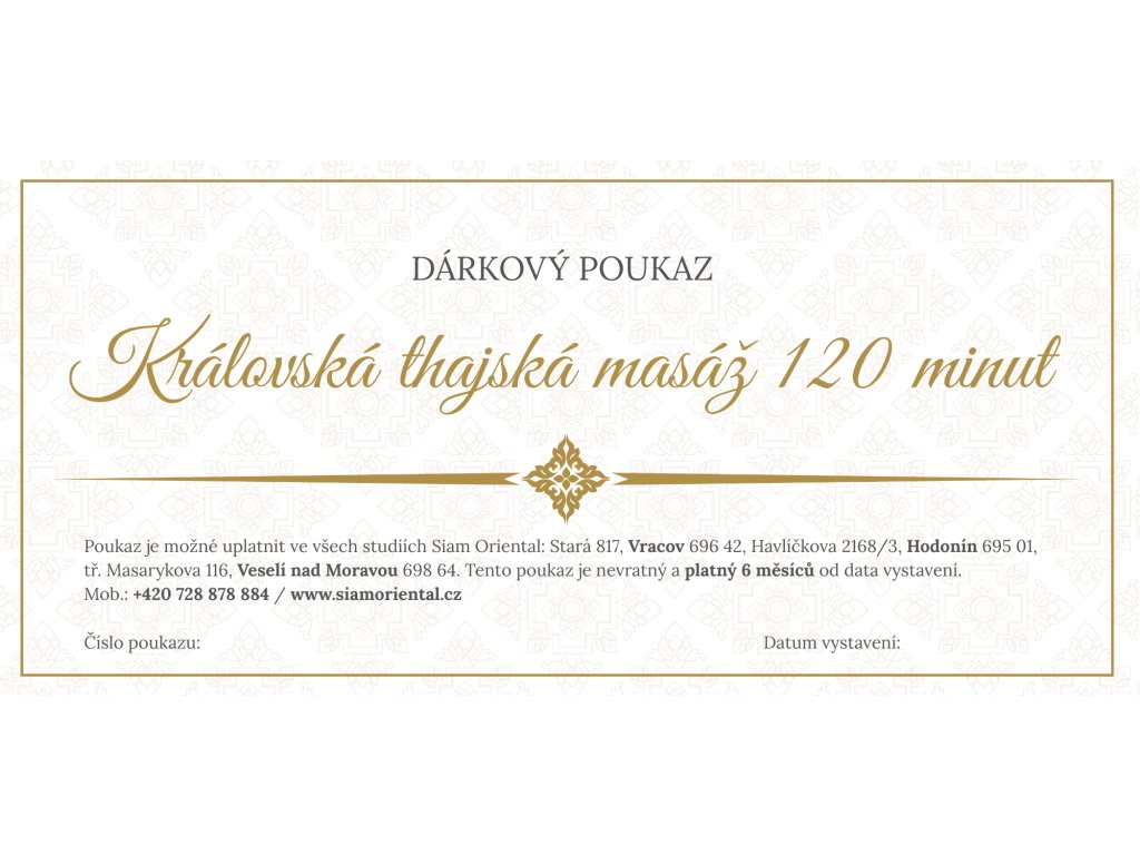 Uplatnění: Poukaz lze využít v kterémkoli z našich salonů Siam Oriental – Vracov, Hodonín, Veselí nad Moravou.