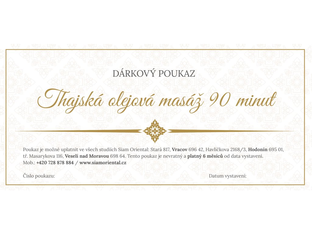 Uplatnění: Poukaz lze využít v kterémkoli z našich salonů Siam Oriental – Vracov, Hodonín, Veselí nad Moravou.